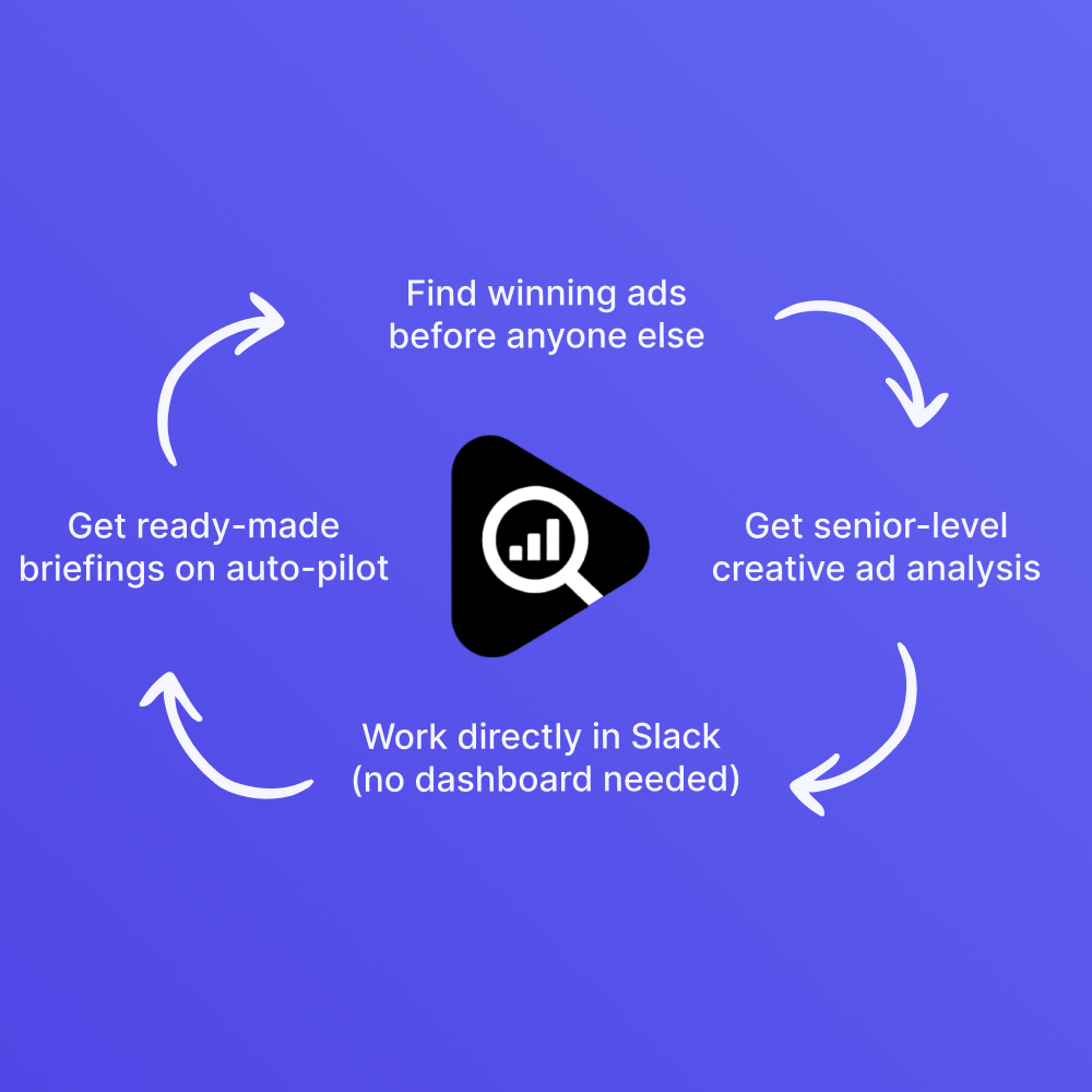 Stop wasting 6+ hours weekly scrolling through irrelevant ads. Get AI-analyzed winning creatives from your competitors delivered directly to Slack, with ready-made creative briefs.