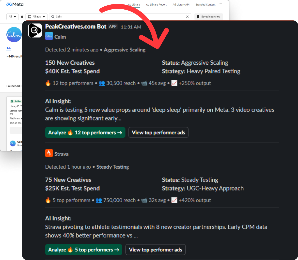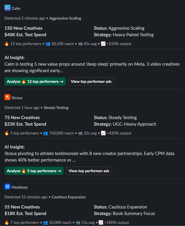 Your competitors’ best ads, analyzed and delivered to Slack.